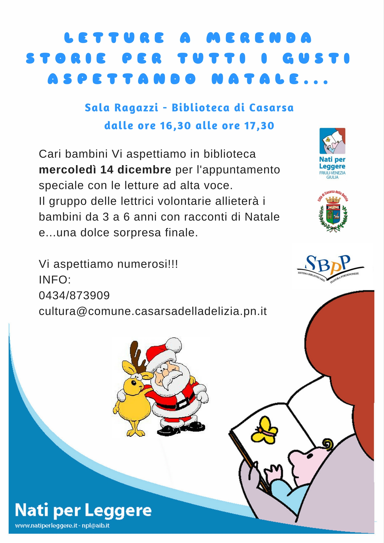 Ultimo grande appuntamento in biblioteca civica per le "Letture a merenda". Grazie alla collaborazione delle donatrici di voce, daremo spazio a letture fantastiche e divertenti ...aspettando Natale.